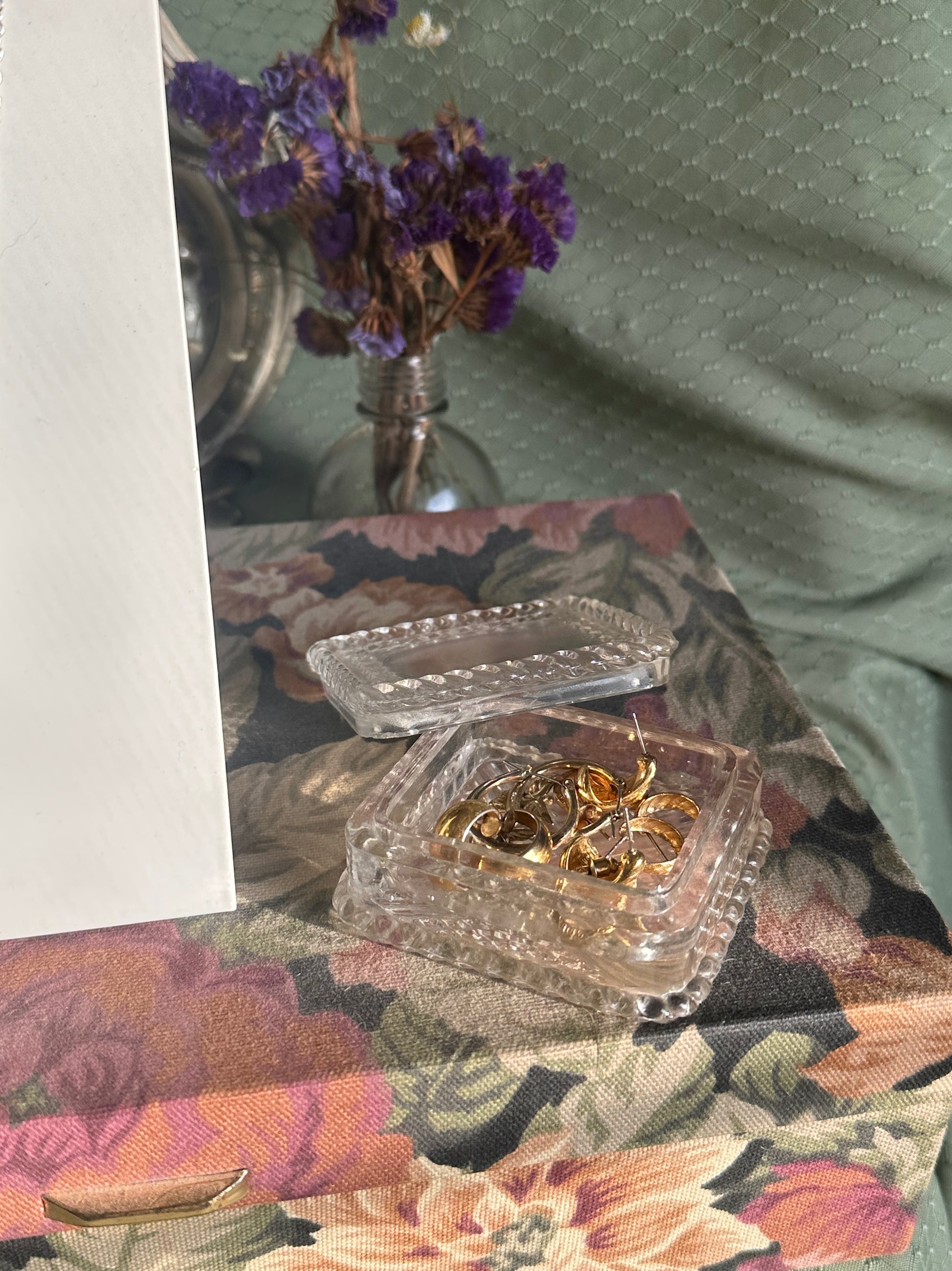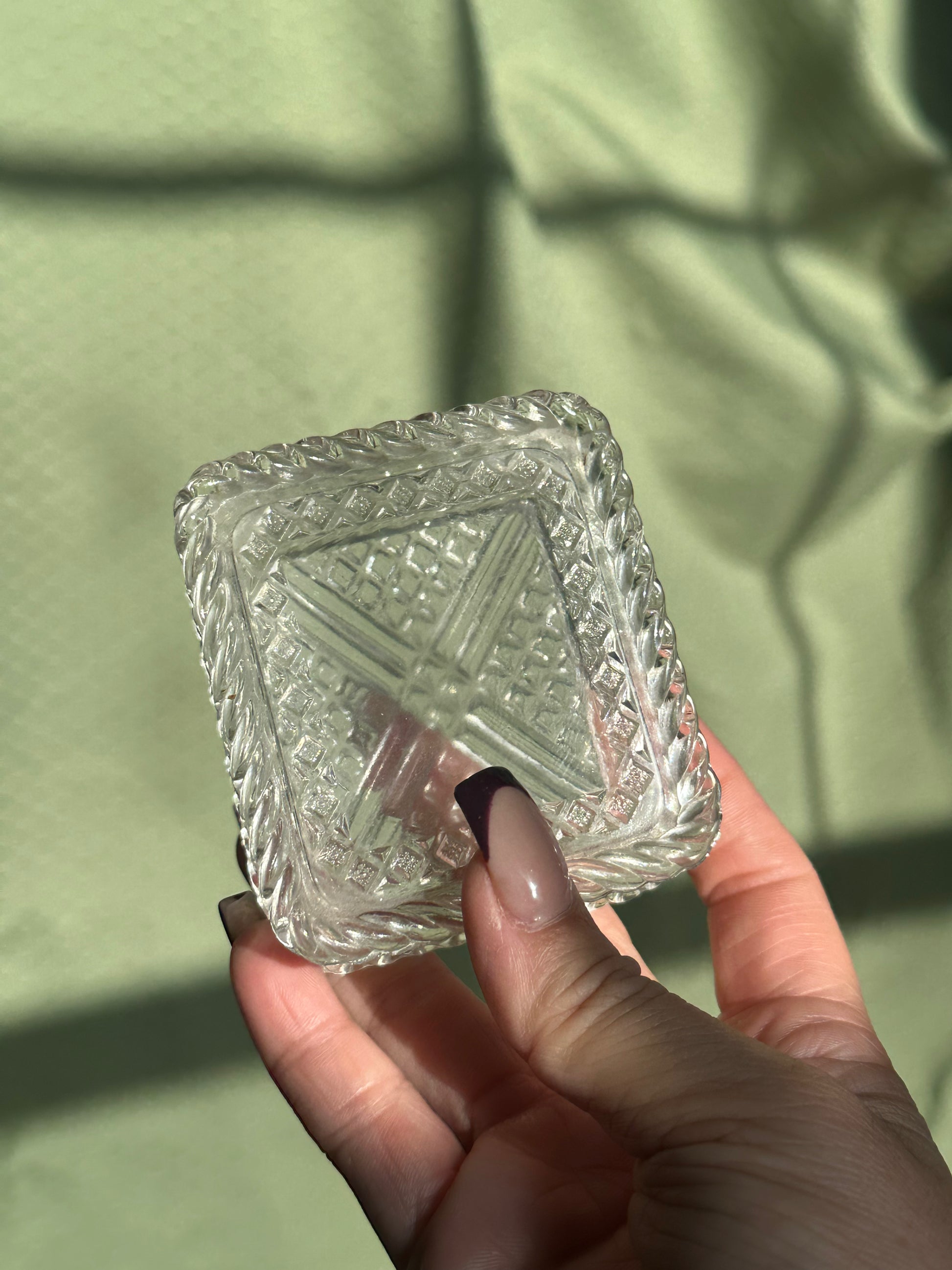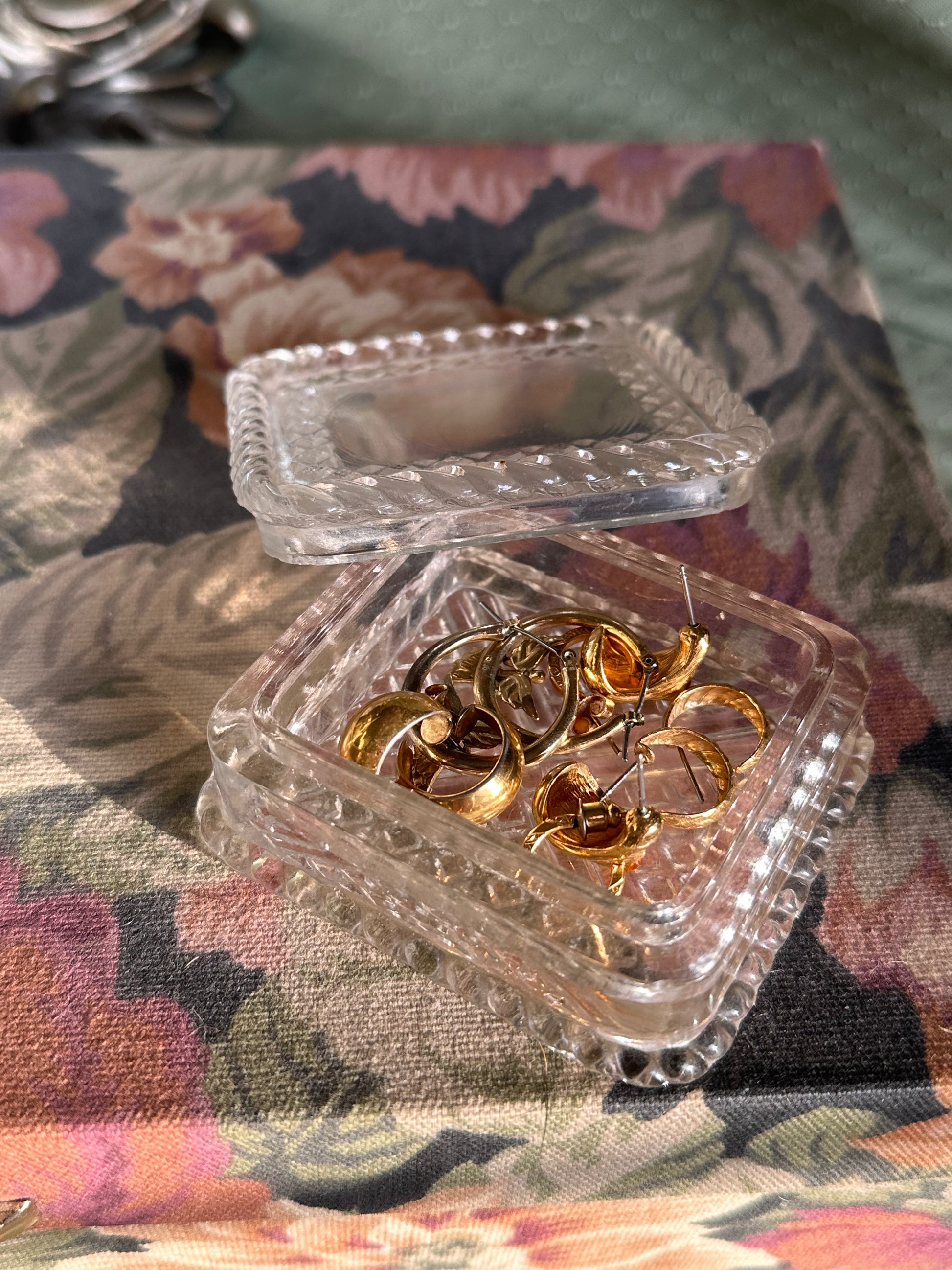 Glass jewelry dish with engravings throughout and piping on the edges