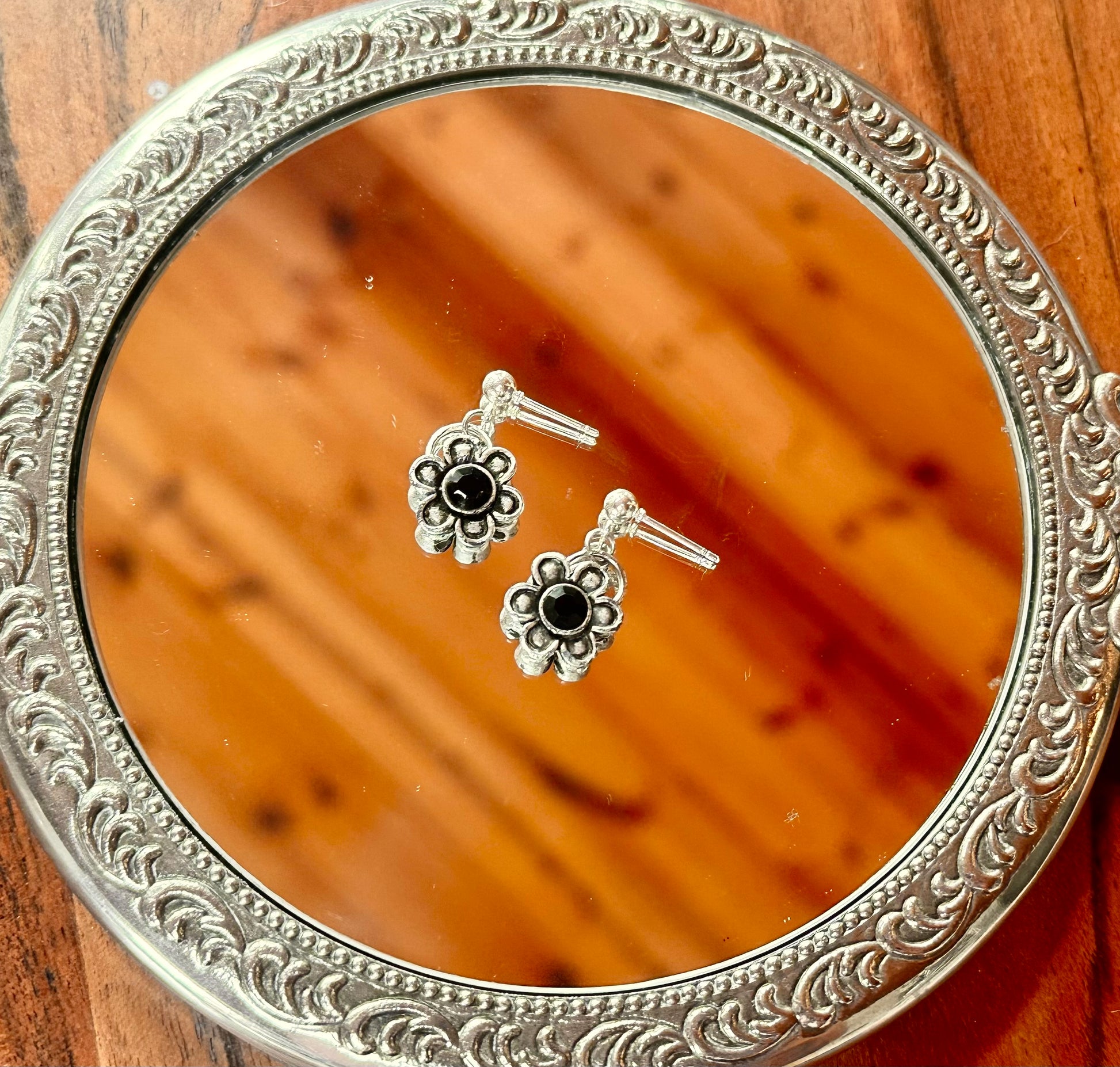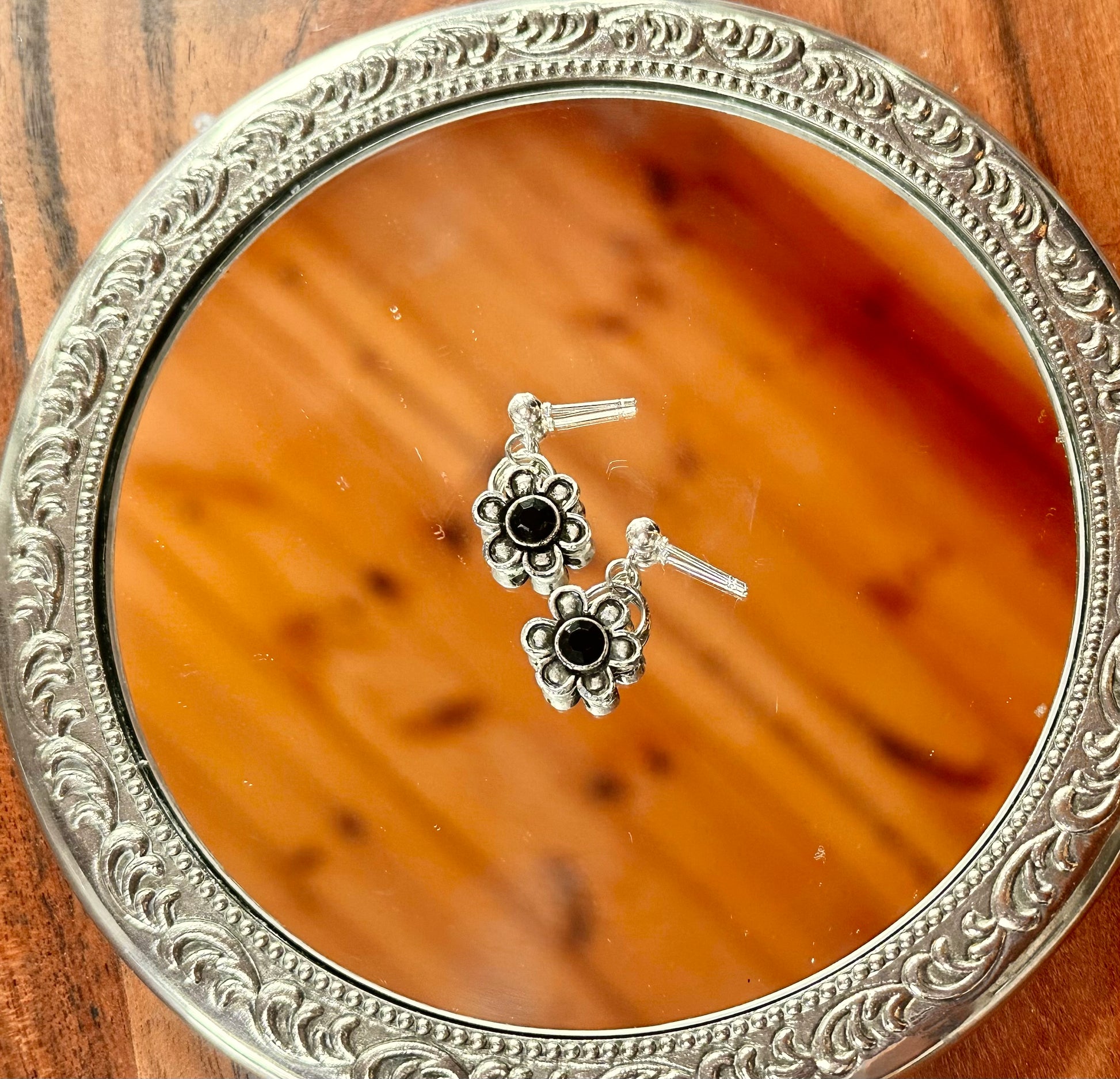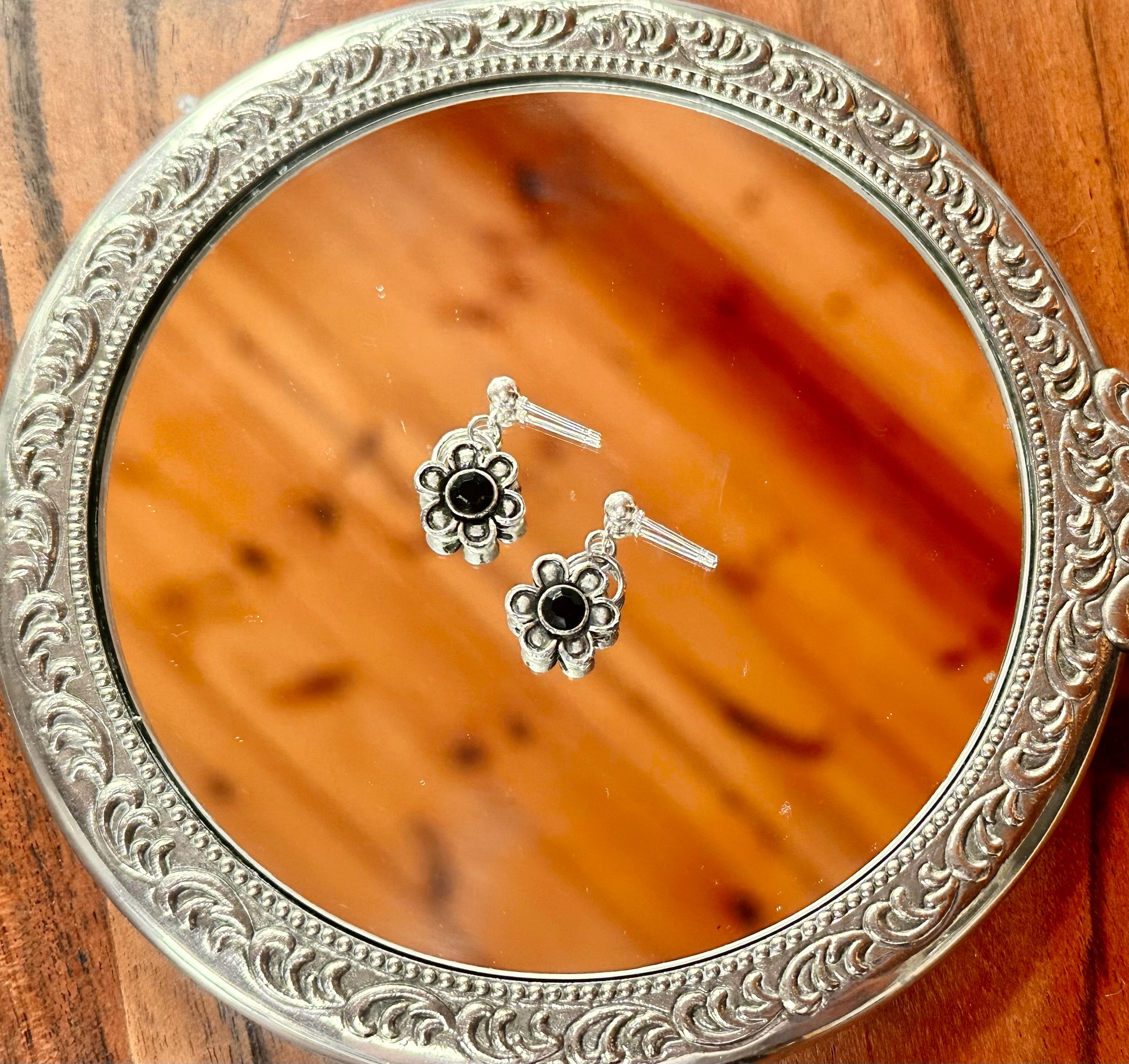 Vintage silver daisy pendant with a black center crystal