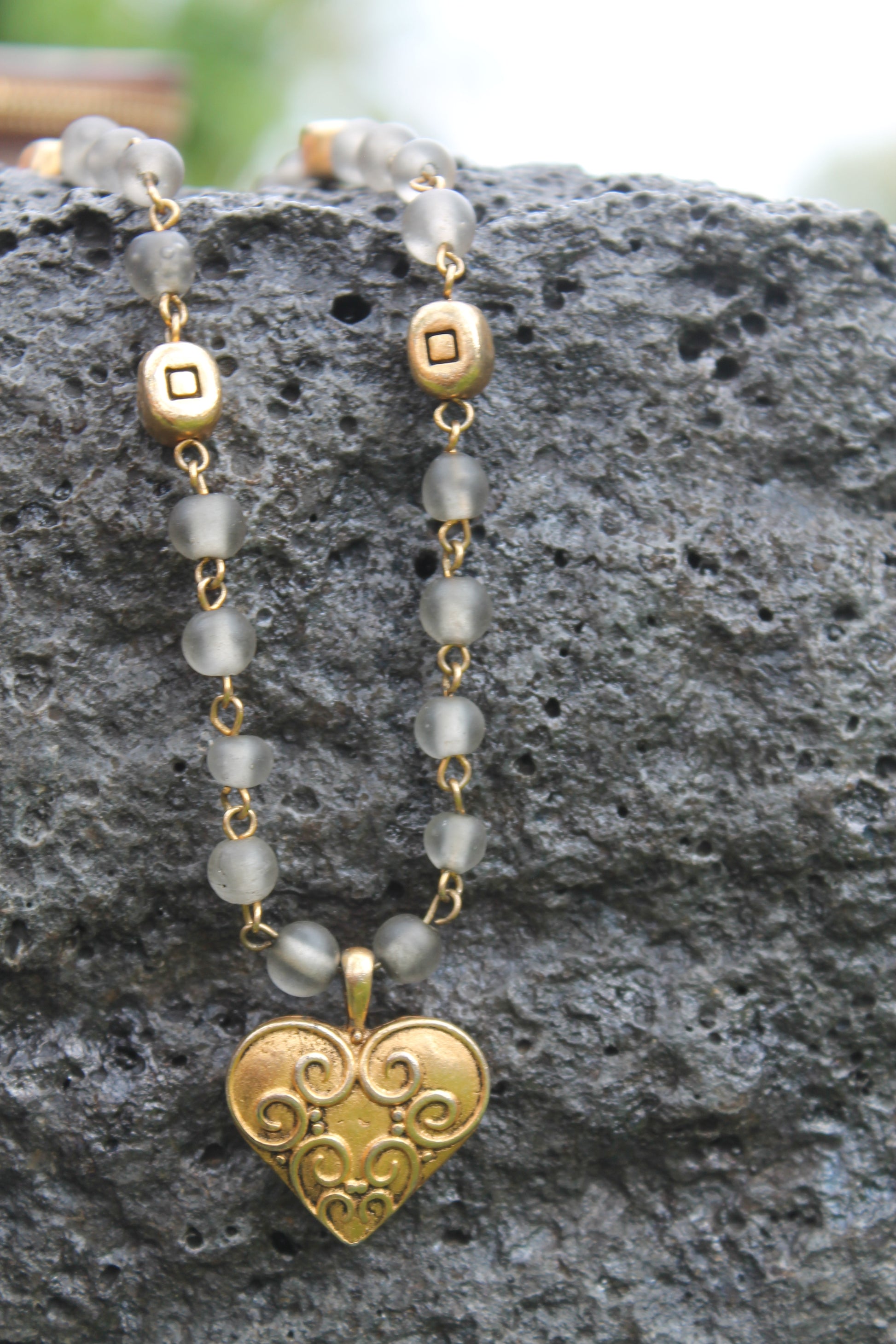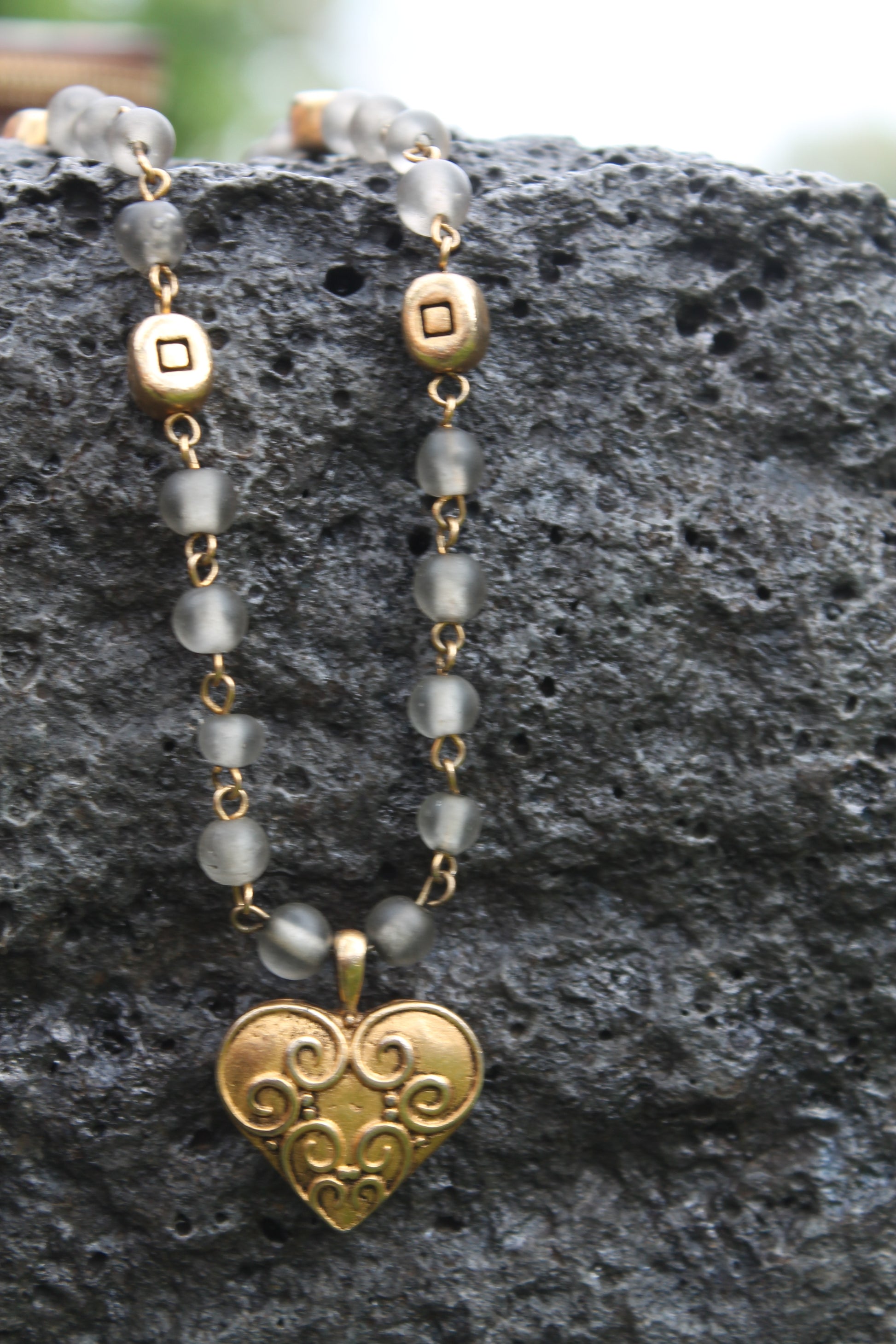 Add a touch of rustic elegance to your jewelry collection with this beautifully handcrafted necklace. Featuring soft, frosted glass beads in a smoky gray hue, this piece blends earthy texture with warm golden accents for a timeless, artisan look.