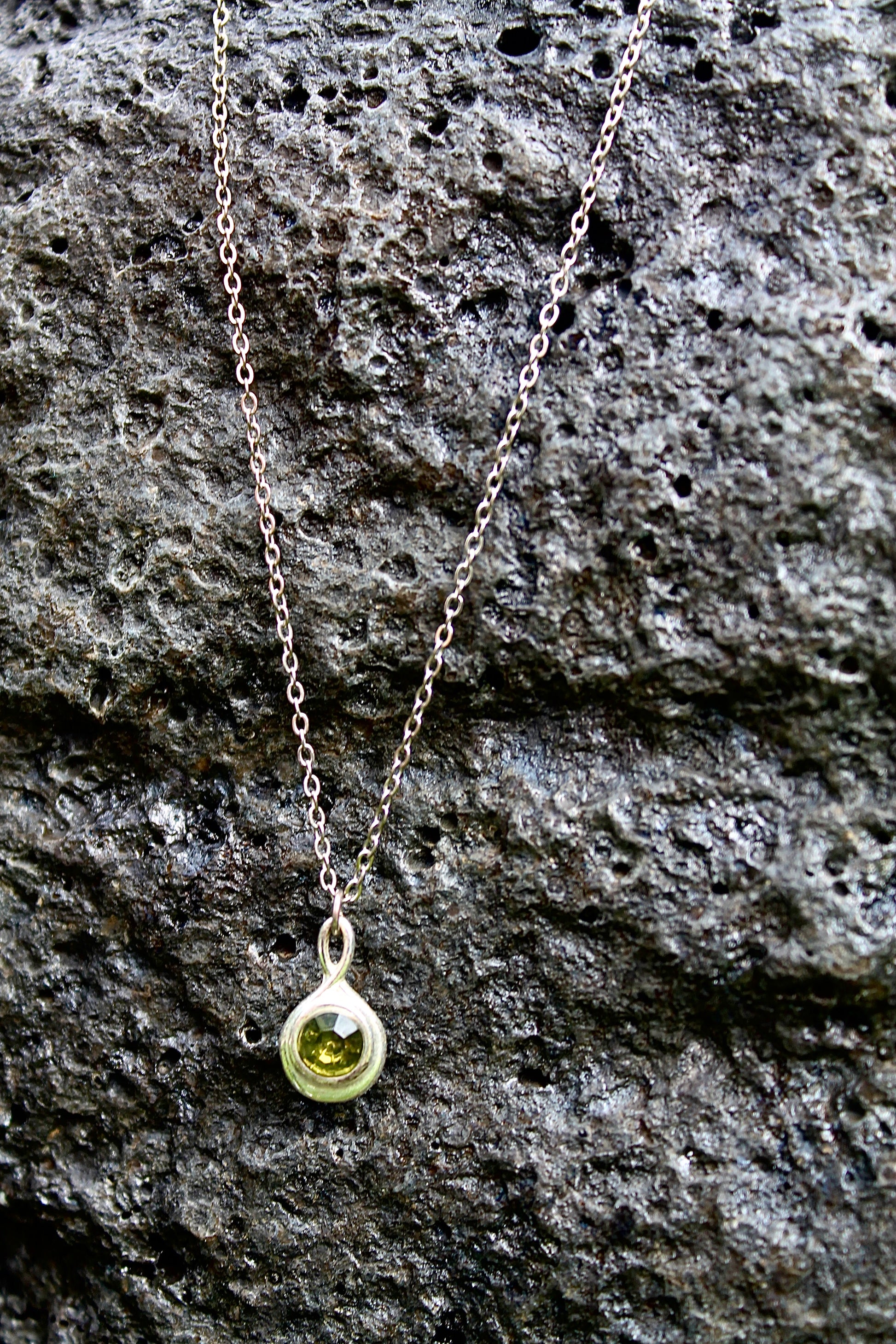 Inspired by the fiery spirit of Pele, the Hawaiian goddess of volcanoes and creation, the Peridot Eye necklace channels the raw beauty and elemental energy of Hawai‘i’s volcanic landscapes. A vibrant green peridot gemstone, reminiscent of new growth emerging from cooled lava, is cradled in a textured teardrop-shaped sterling silver setting, echoing the molten flow of lava.