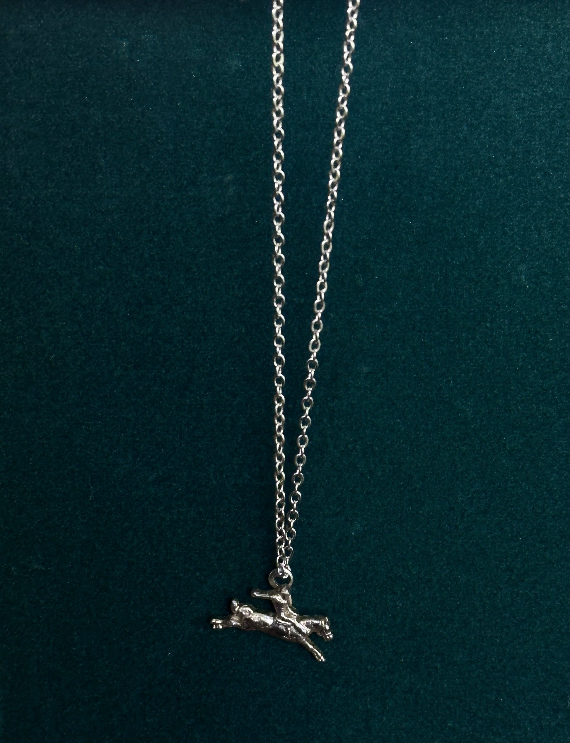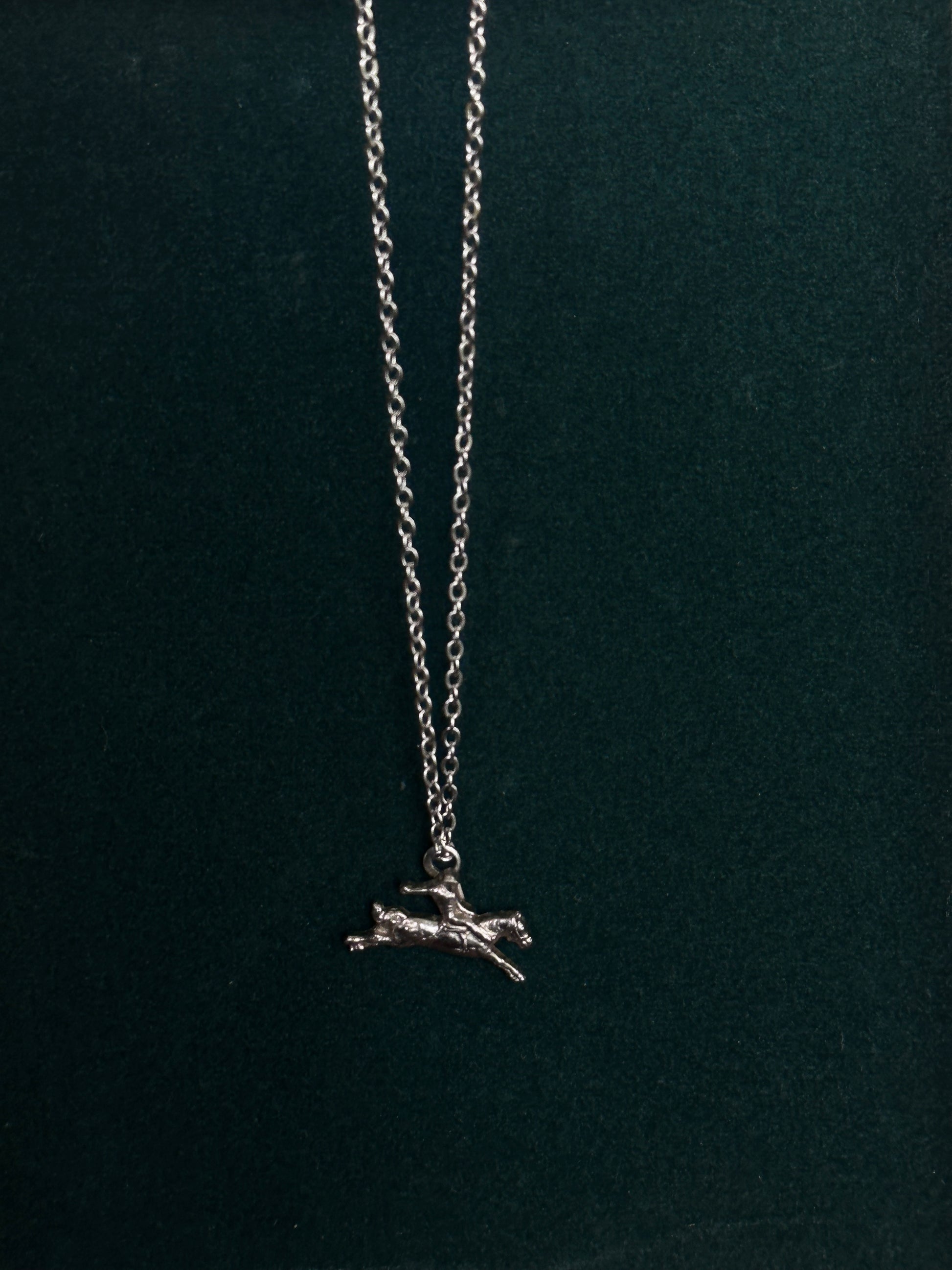 Meet "Ride em Cowboy", a finely crafted vintage silver necklace featuring a miniature cowboy mid-gallop atop his trusty steed