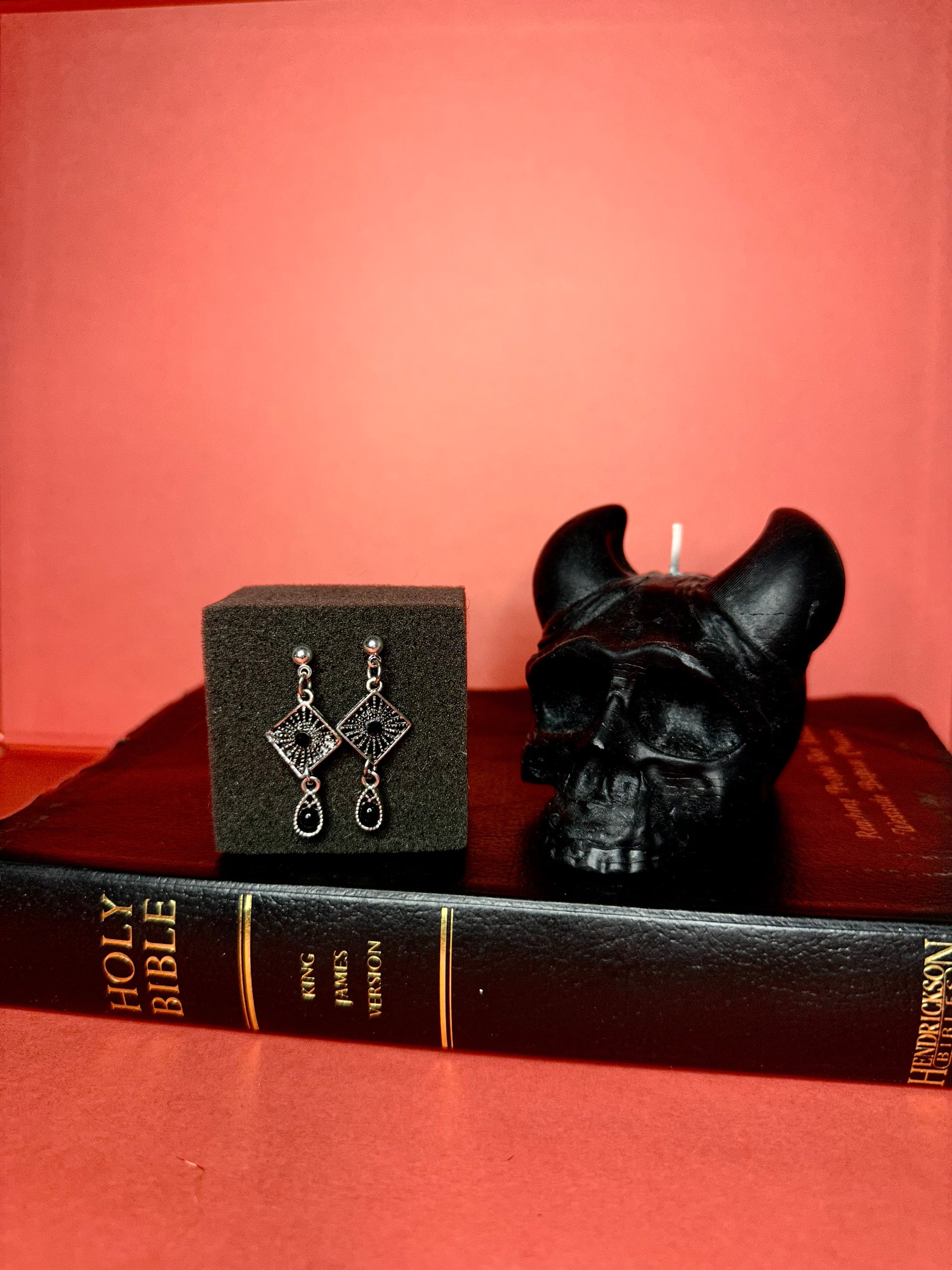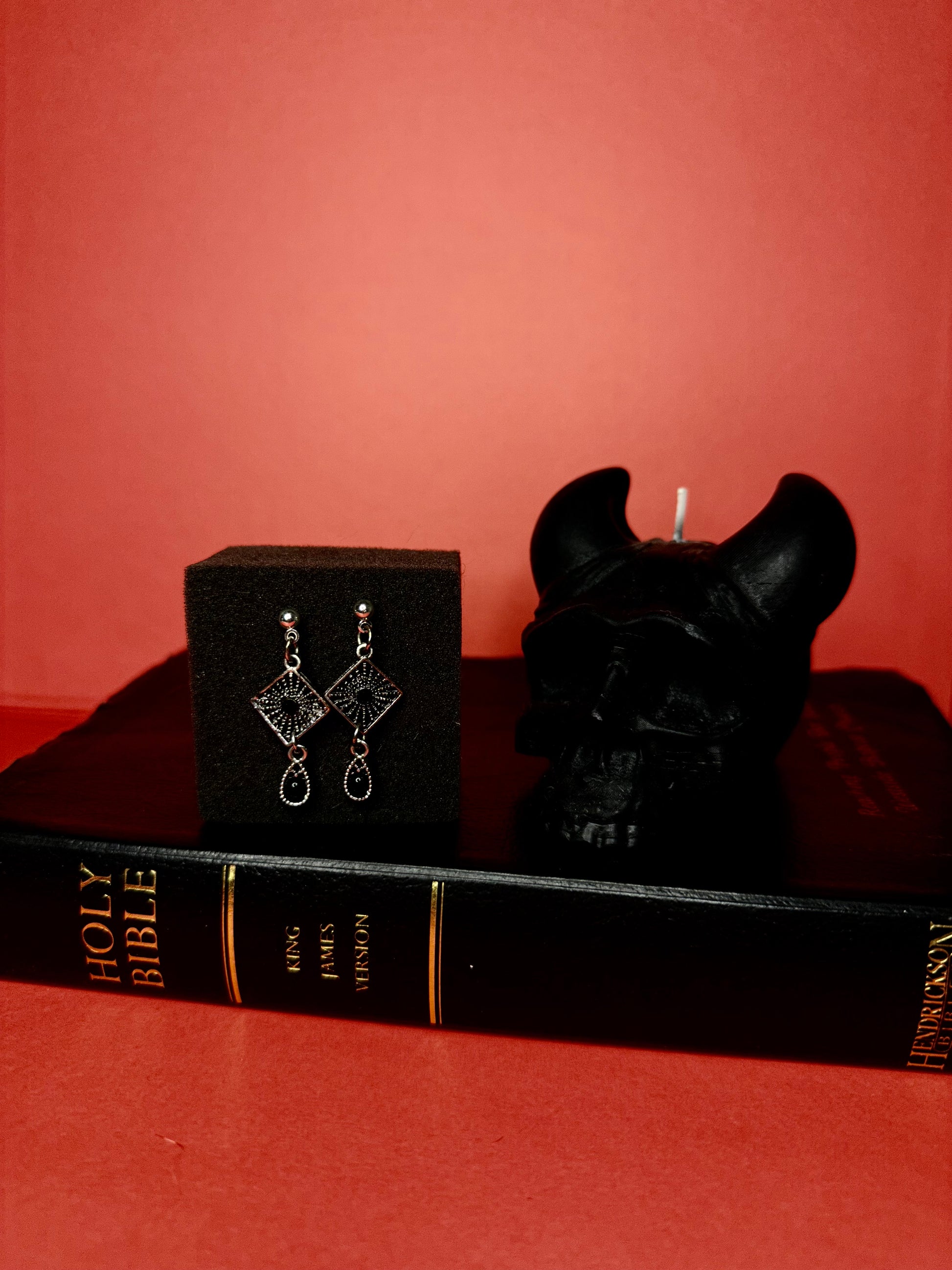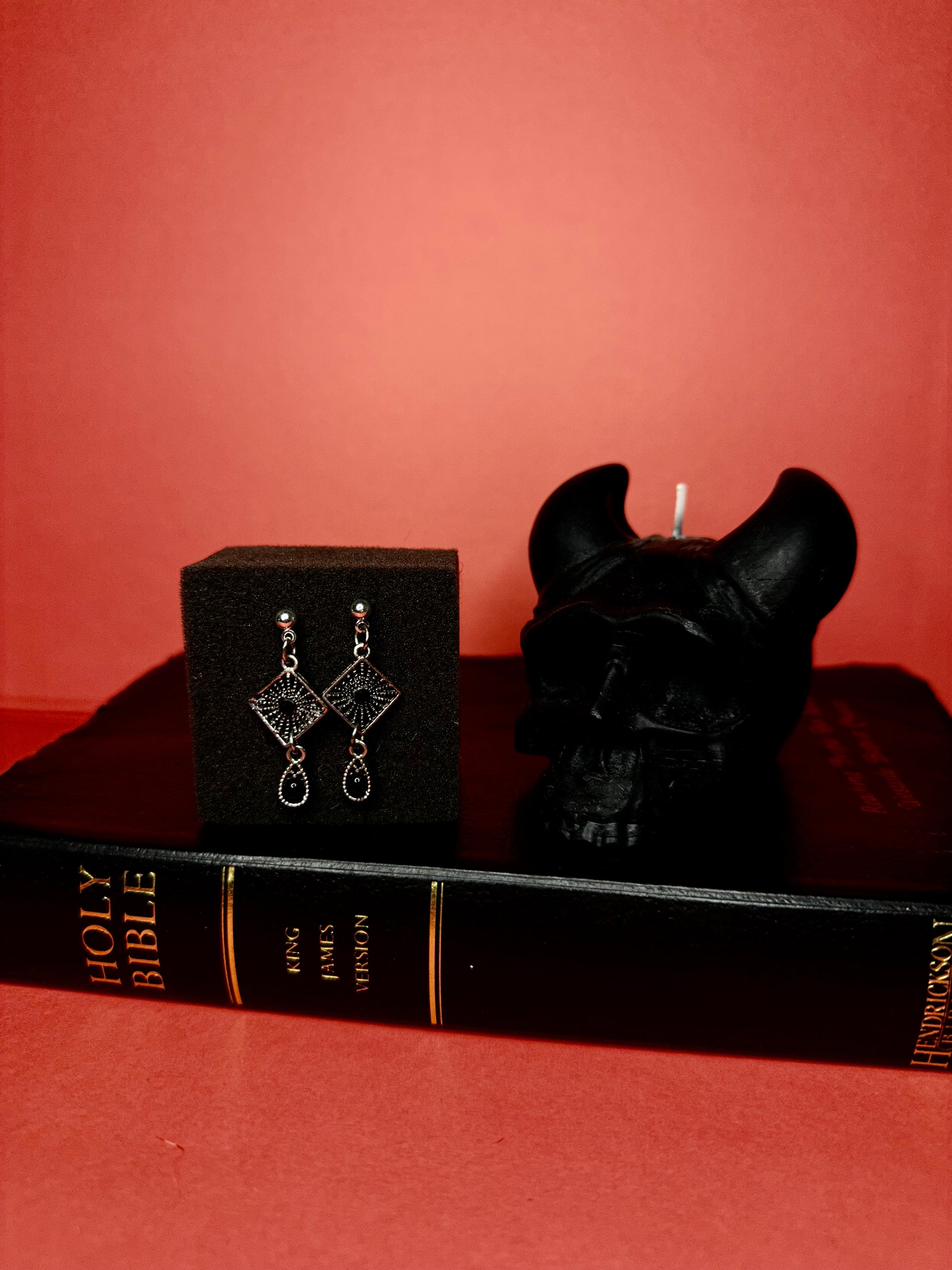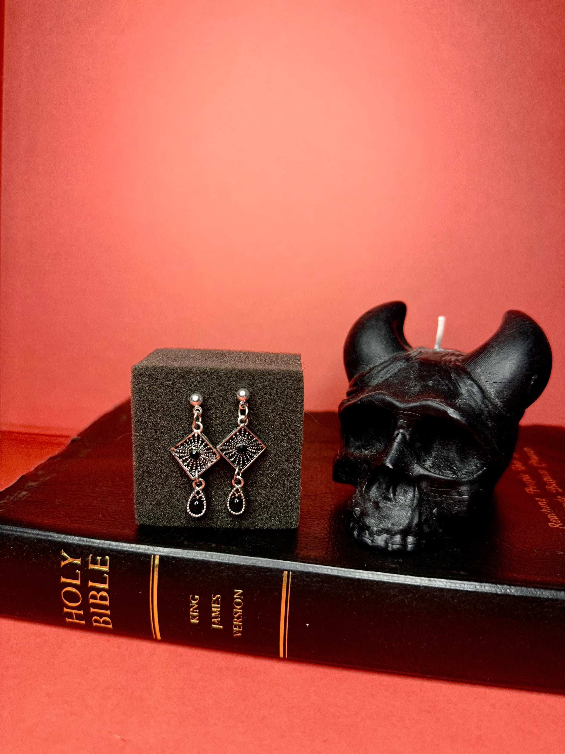 adorned with a diamond shaped cobweb pendant and a small black stone detail