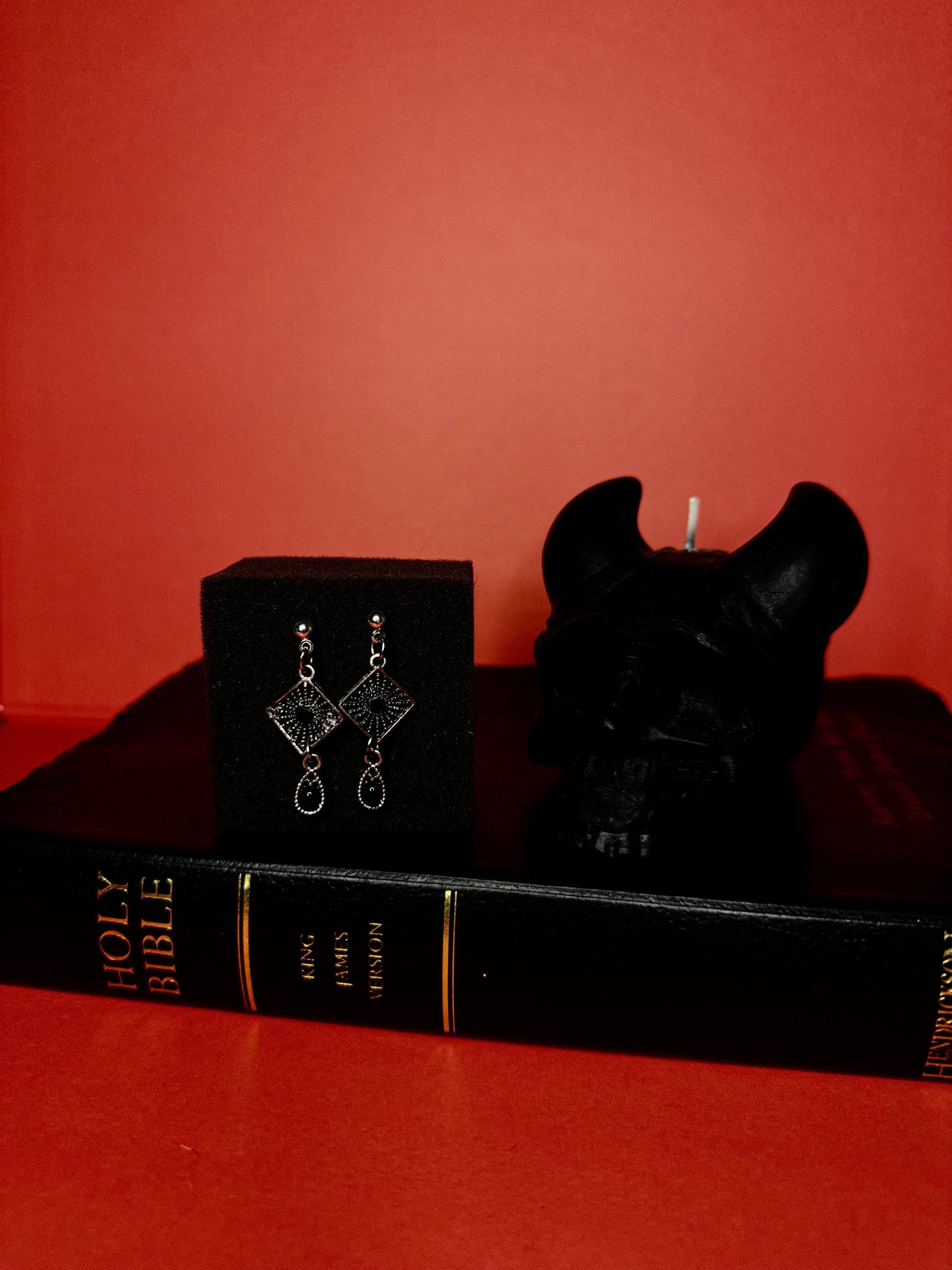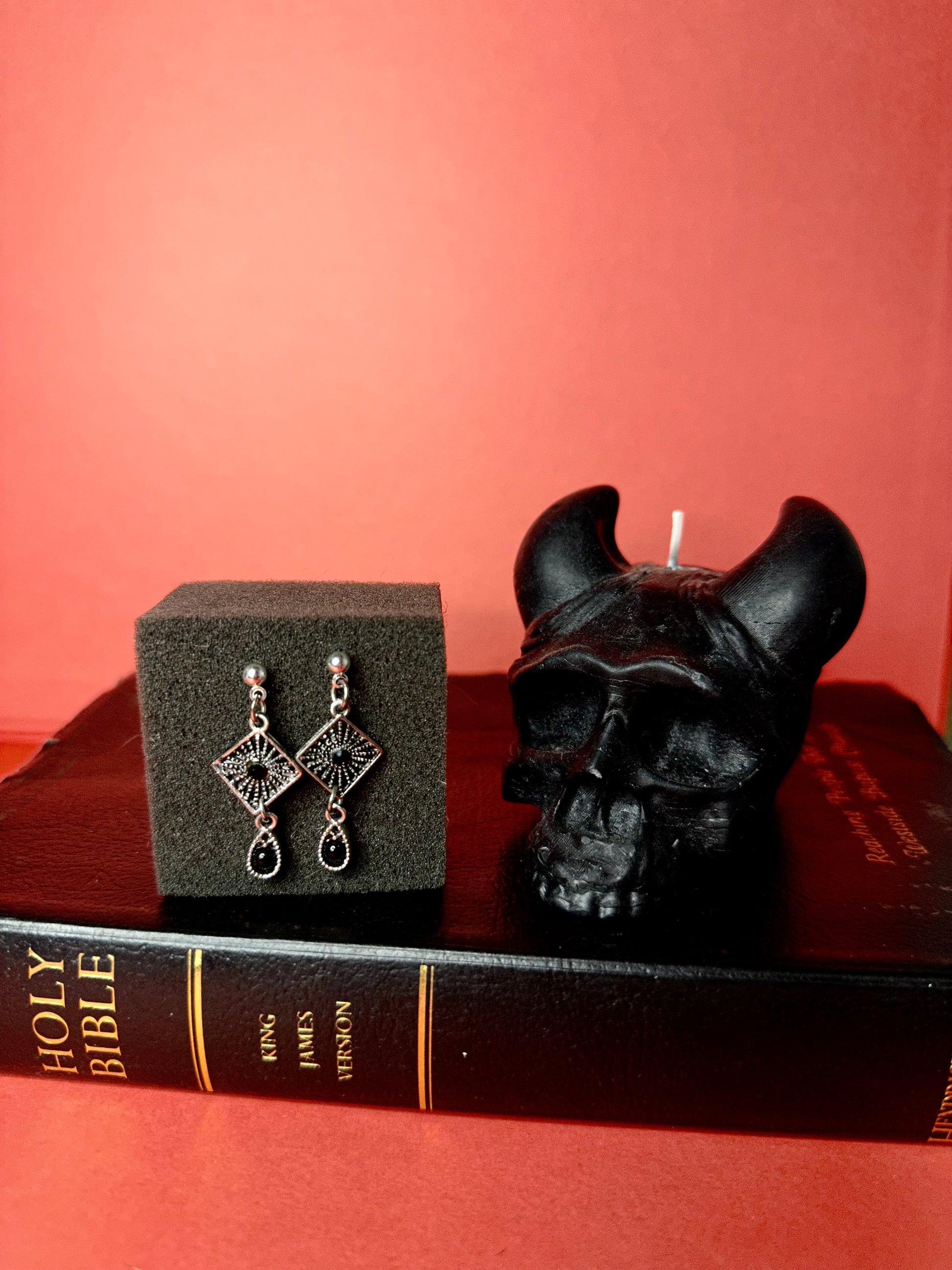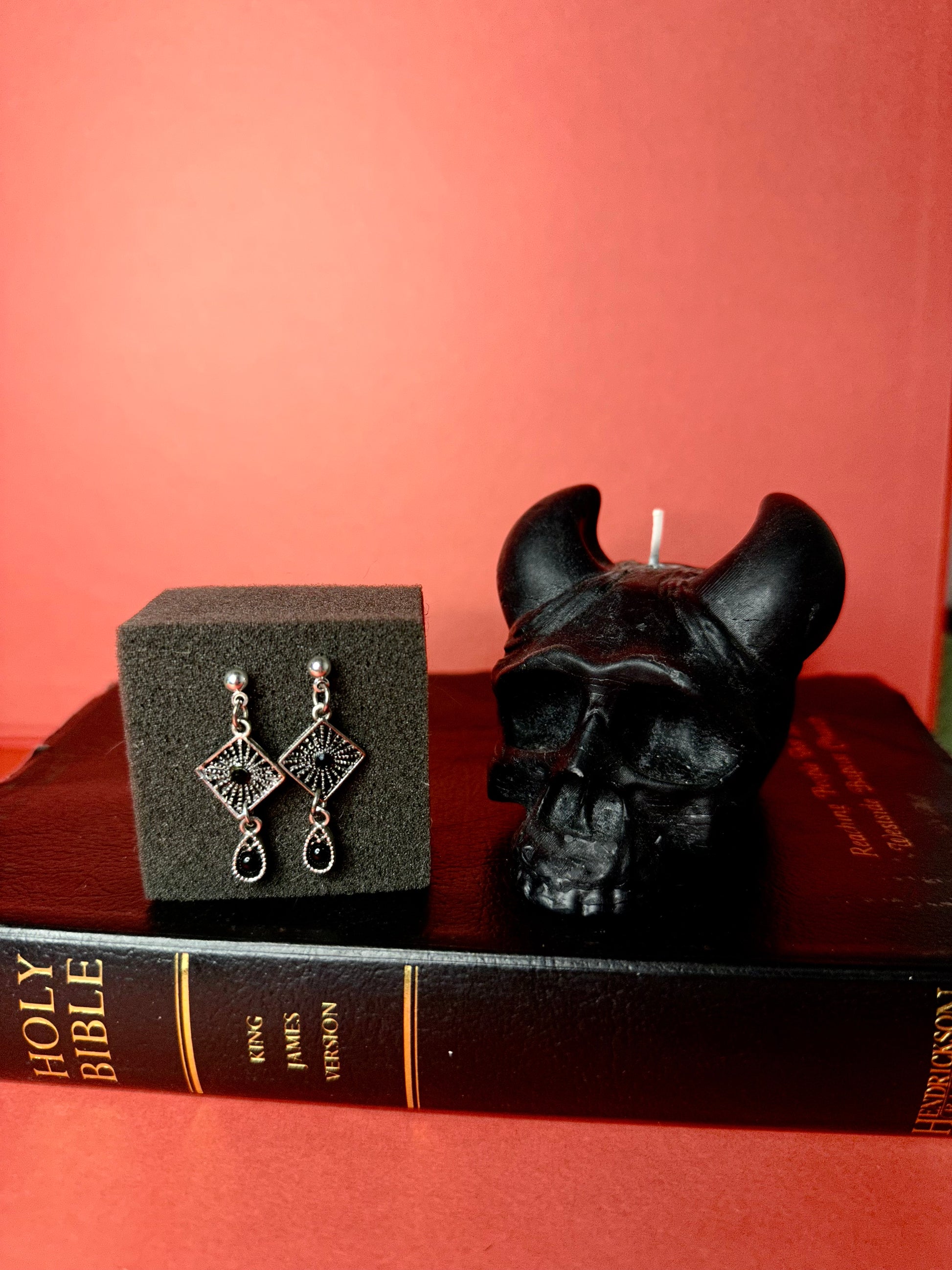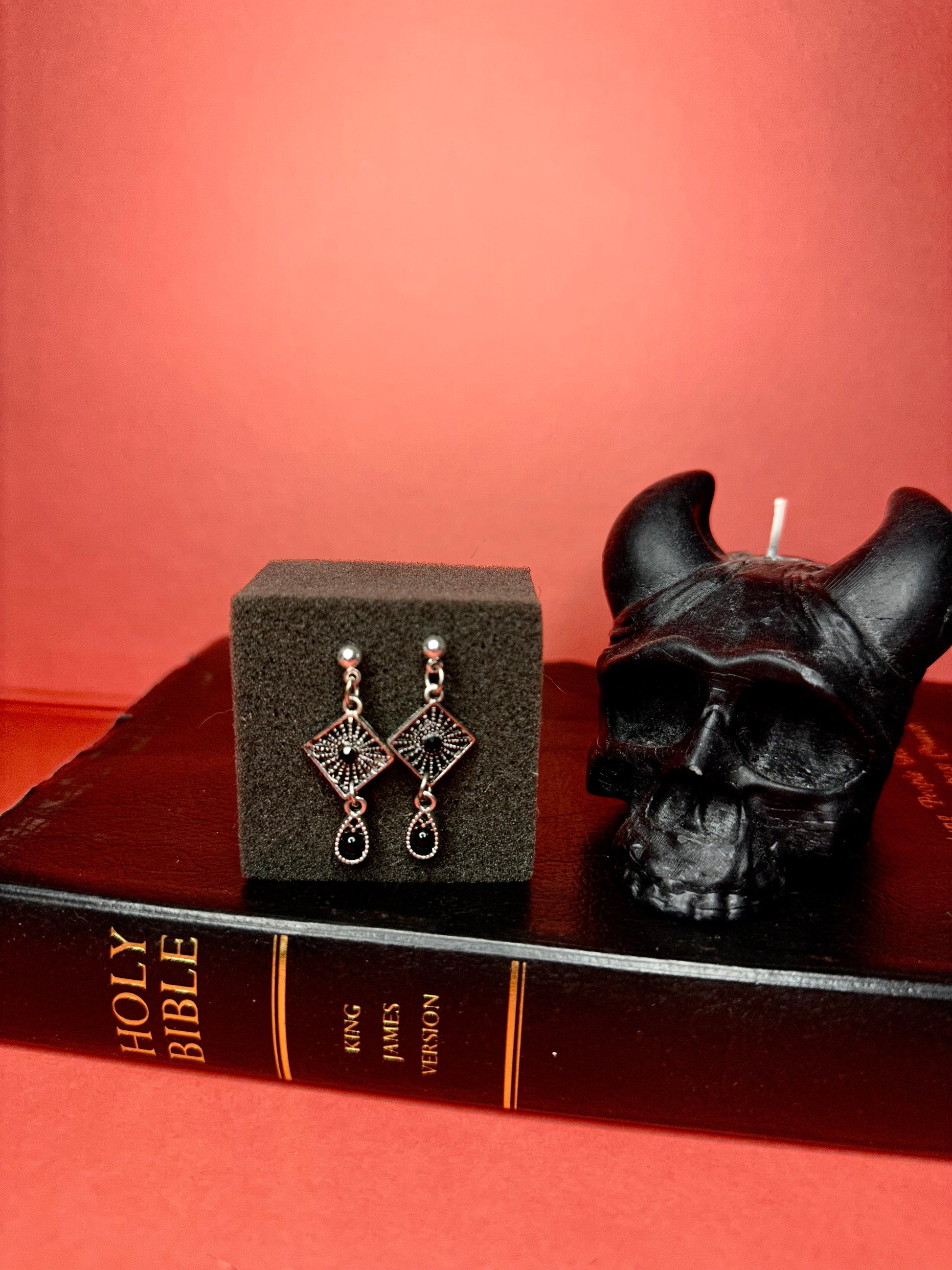 adorned with a diamond shaped cobweb pendant and a small black stone detail